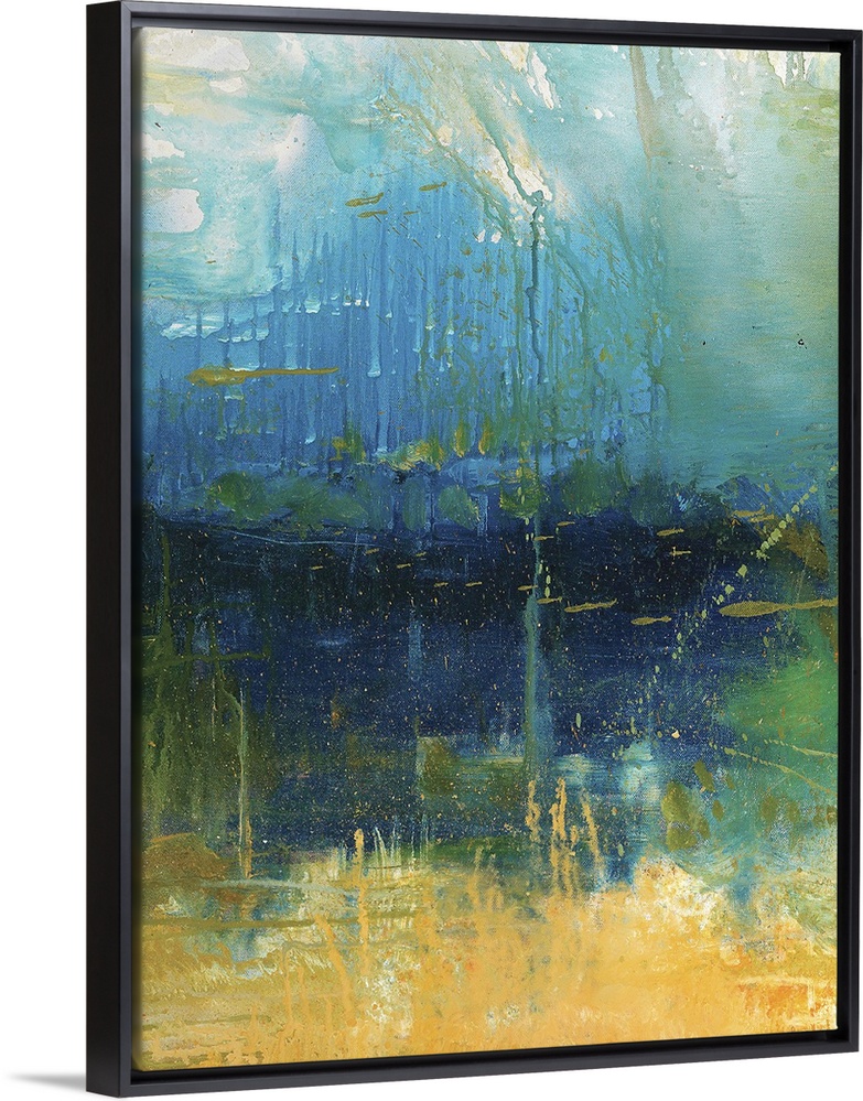 <p>Abstract painting in blue, green, yellow, and orange hues.</p>