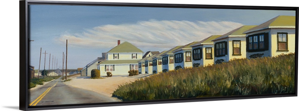 <p>Contemporary painting of a row of identical houses along a road in the suburbs.</p>