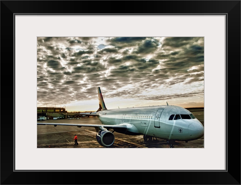 <p>Airport daybreak shot of plane waiting to depart as storm clouds pass overhead.</p>