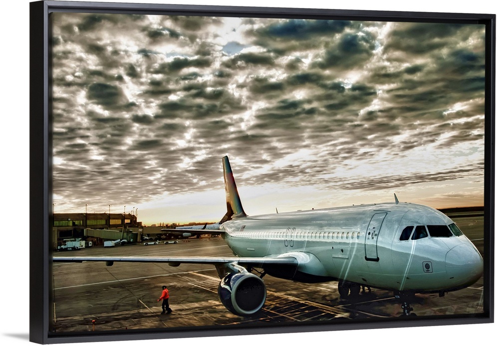 <p>Airport daybreak shot of plane waiting to depart as storm clouds pass overhead.</p>