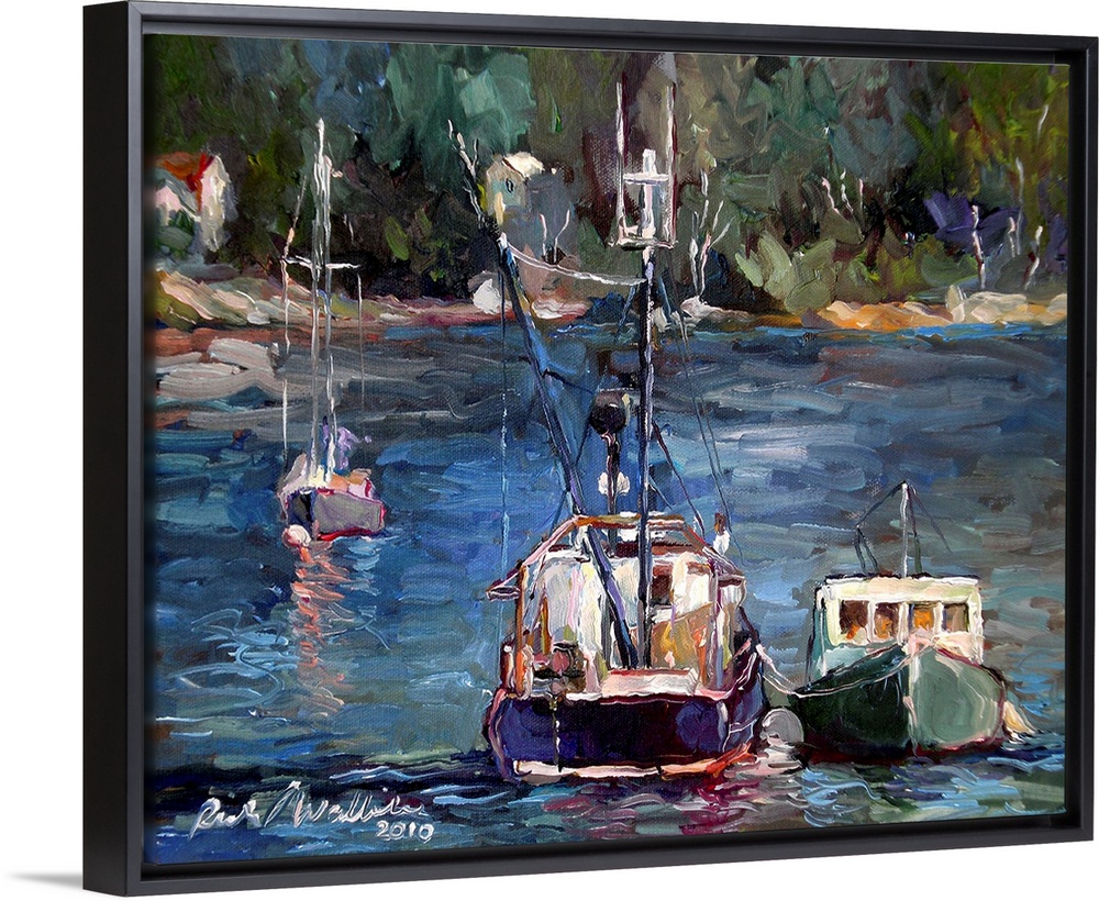 <p>Contemporary painting of a fishing boat in a harbor.</p>