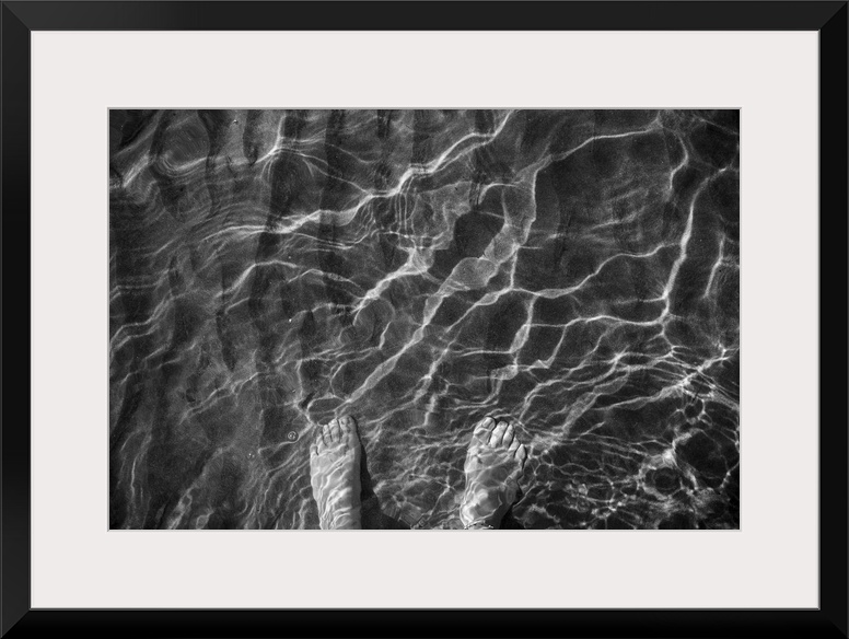 <p>A woman's feet in the sand, through the crystal clear water, in the beach</p>