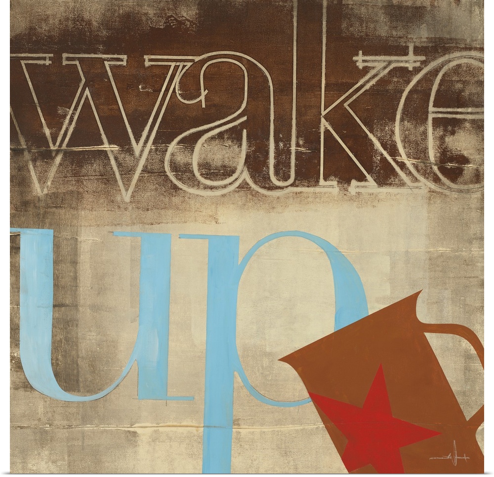 <p>Decorative artwork of a cup of coffee with the text "Wake Up" in rustic browns and blue.</p>