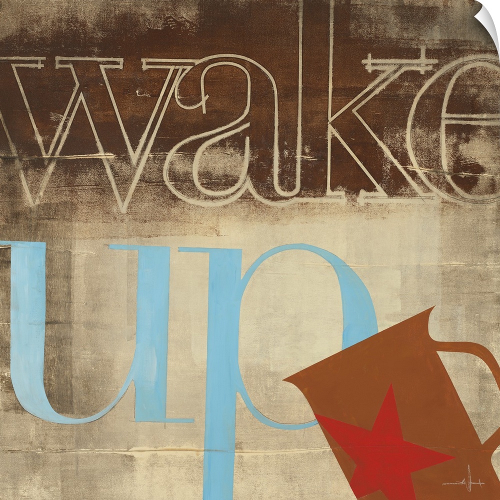 <p>Decorative artwork of a cup of coffee with the text "Wake Up" in rustic browns and blue.</p>