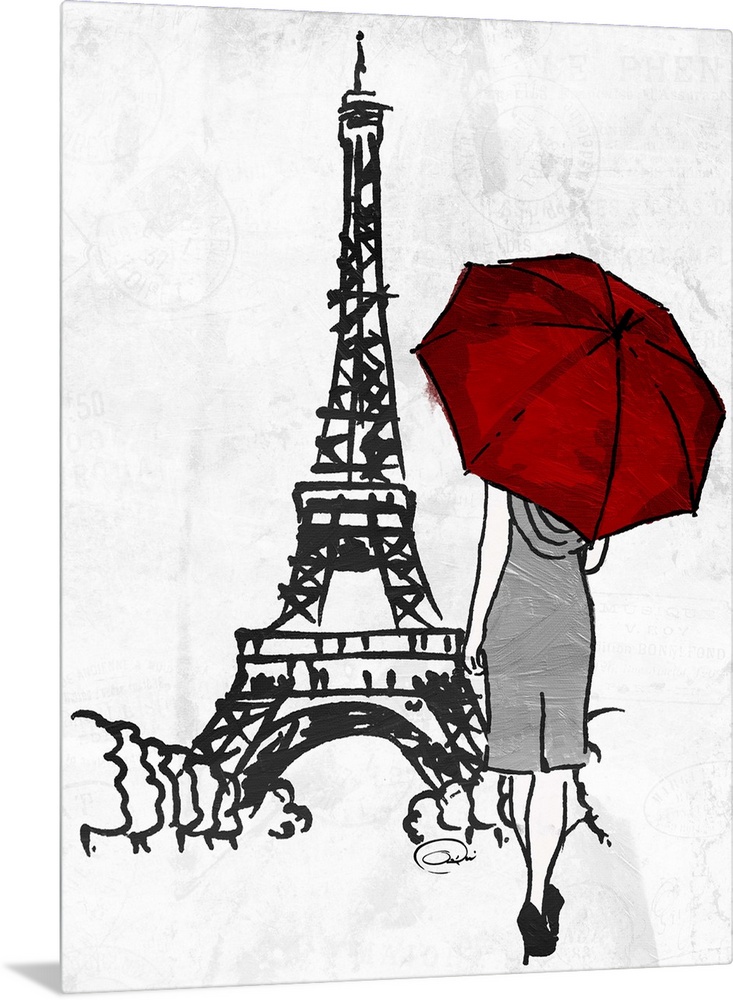<p>Ink drawing of a woman with a red umbrella walking towards the Eiffel Tower.</p>