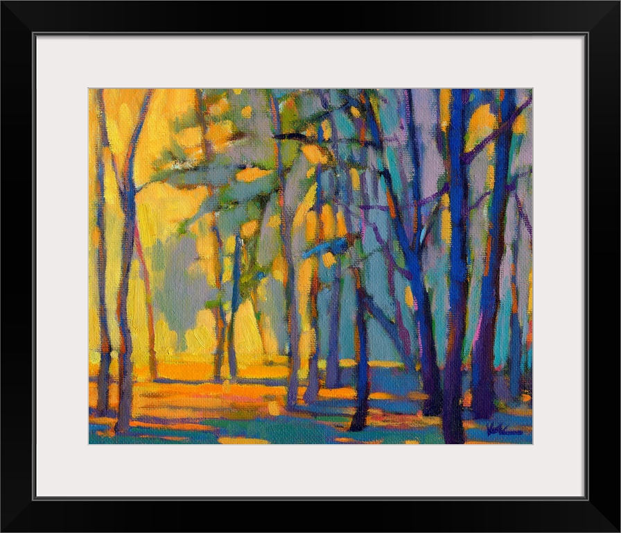 <p>Contemporary painting of trees in a forest with strong golden light shining through at golden hour.</p>