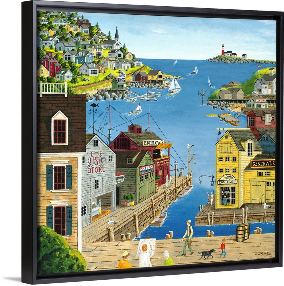 <p>Americana scene of an oceanside town with stores and houses on the edge of the harbor.</p>
