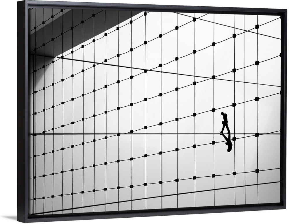 <p>Conceptual image of a person walking on a thin line, one of many on the side of a building.</p>