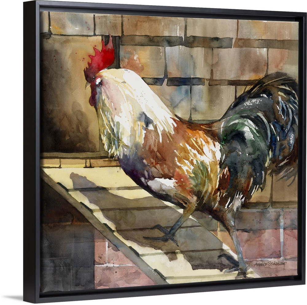 <p>Rooster walking up the plank into the hen house.</p>
