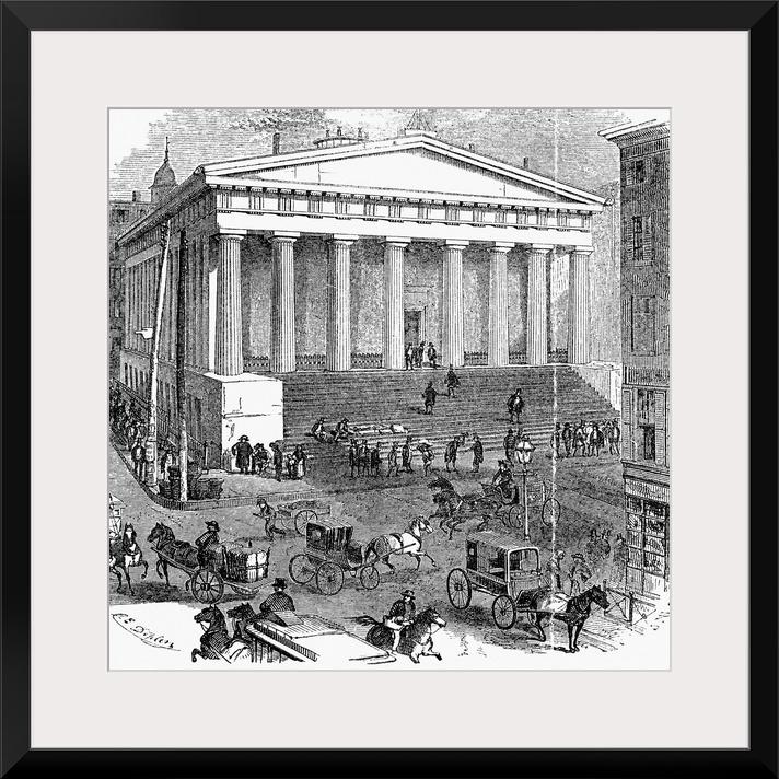 <p>The United States Sub-Treasury Building (the Old Customs House) at Wall and Nassau Street. Wood engraving, 1865.</p>