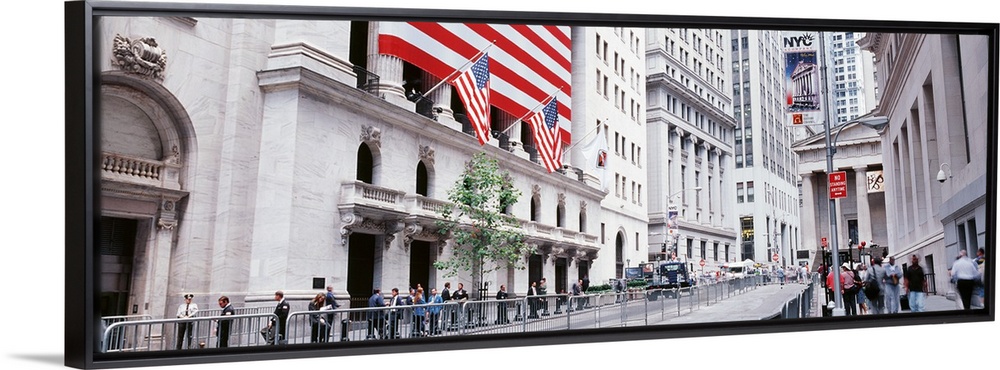 <p>Large panoramic photograph of wall street in NYC with people walking on the sidewalk and a large American flag to the left in the picture.</p>