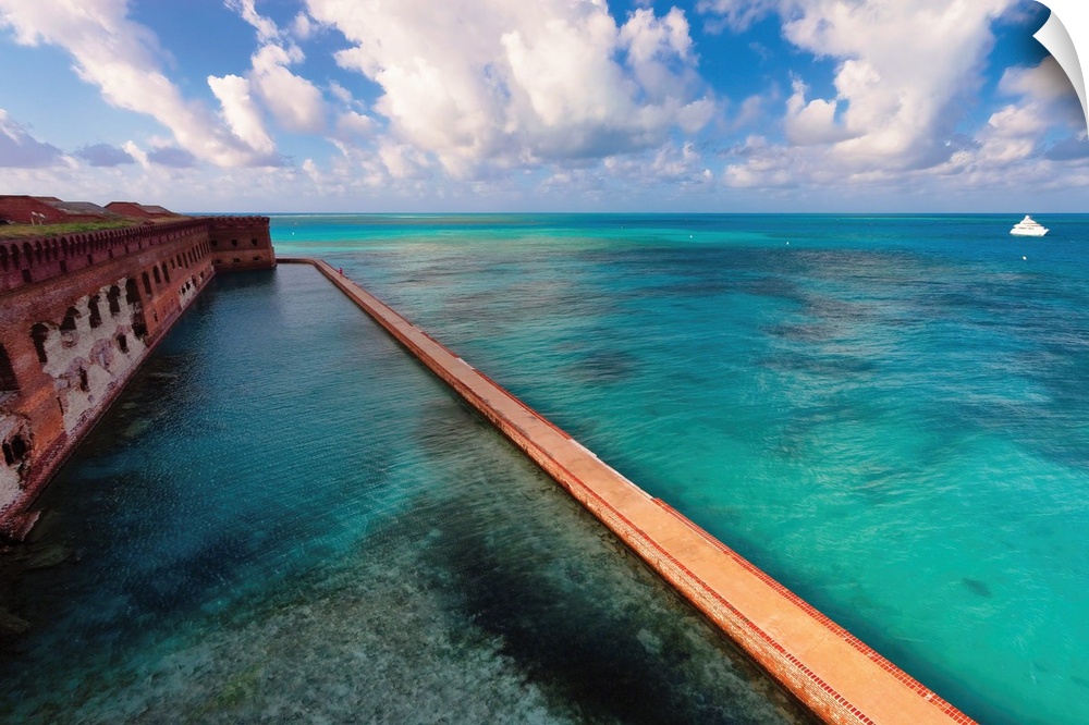 <p>High angle view of the walls and moat of a brick fort, Fort Jefferson, Dry Tortugas National Park, Florida.</p>