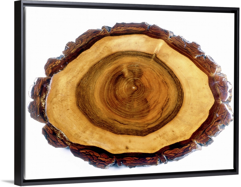 <p>Walnut tree trunk. Cross-section of the trunk of a walnut tree (Juglans regia), showing its different rings. On the outside is the cork, which exhibits the characteristic pattern of cork layers that are laid down at angles to one another. The cork is an external, secondary tissue impermeable to water and gases and protects the wood beneath. The wood is divided into an outer layer of sapwood (living wood in a growing tree) and a central layer of dead wood (heartwood) that is impregnated with tannins and resins. Tannins and resins deter fungi, bacteria and insects, and so make it resistant to decay. Walnut is one of the finest woods for cabinet makers because of its beautiful grain.</p>