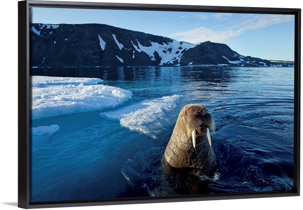 <p>Norway, Svalbard, Walrus (Odobenus rosmarus) emerges beside ice floe in Zeipelbukta (Zeipel Bay) lit by midnight sun</p>