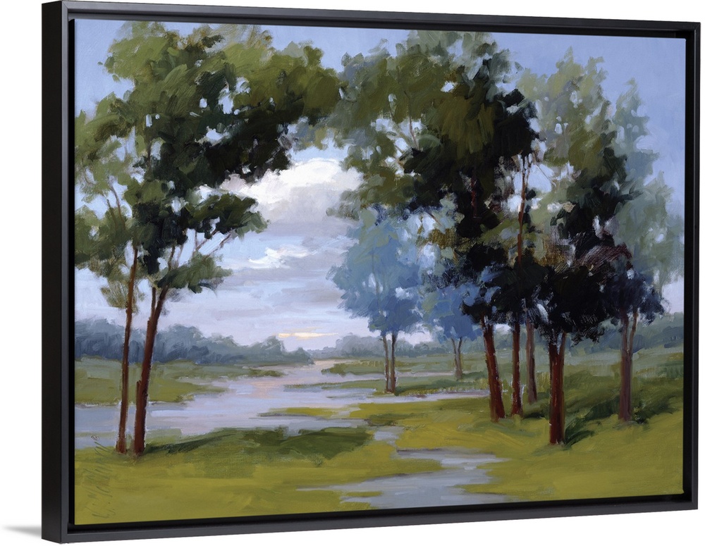 <p>A traditional contemporary landscape of a stream surrounded by trees with white clouds in a blue sky.</p>