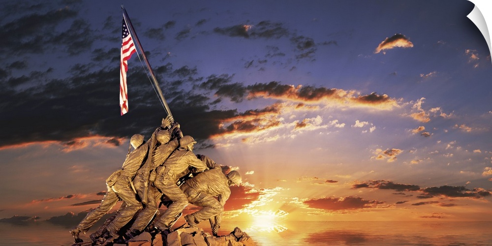 <p>Composite image of a statue of American soldiers raising a flag on a rocky mount and the sun setting on the ocean's horizon.</p>
