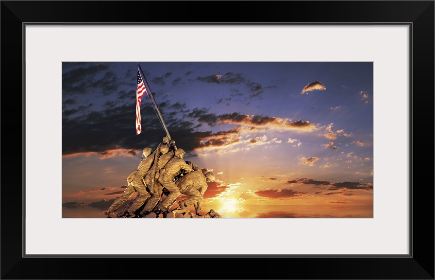 <p>Composite image of a statue of American soldiers raising a flag on a rocky mount and the sun setting on the ocean's horizon.</p>