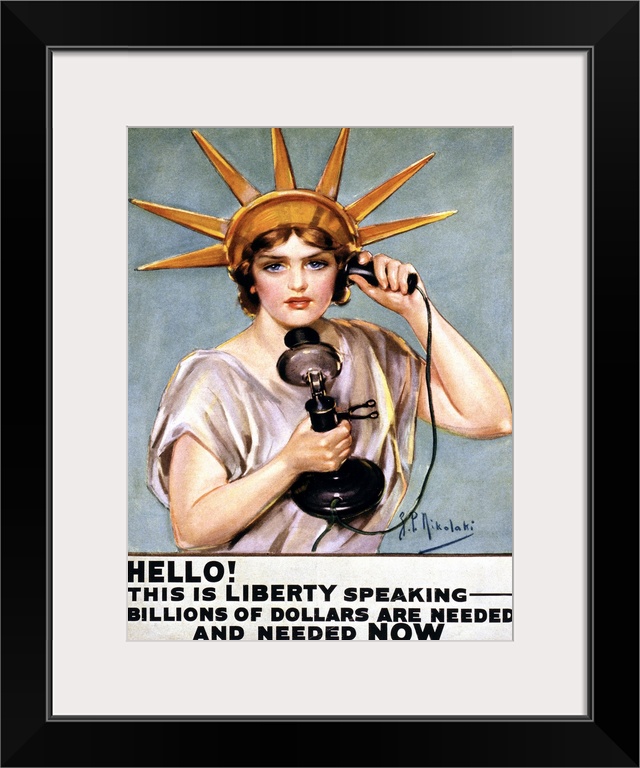 <p>An American war poster depicting a woman dressed as the Statue of Liberty, talking on the telephone saying 'Hello! This is Libertyspeaking. Billions of dollars are needed and needed now.' Color lithograph by Z.P. Nikolaki, c1918.</p>