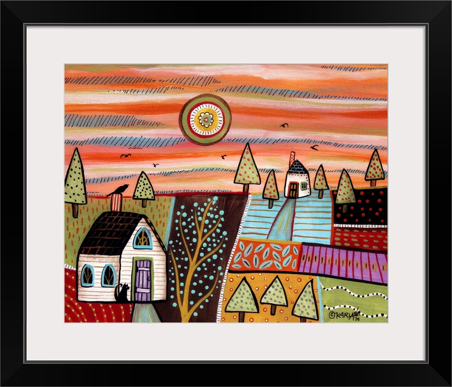 <p>A contemporary folk art style painting of a rolling countryside landscape.</p>