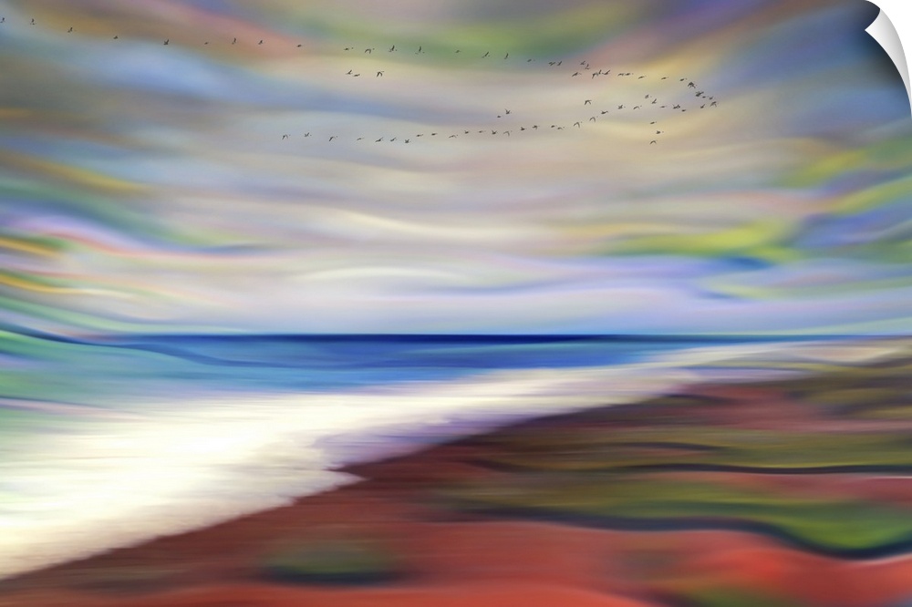 <p>Abstract photograph of blurred and blended colors and flowing lines, resembling foamy ocean waves on a red beach.</p>