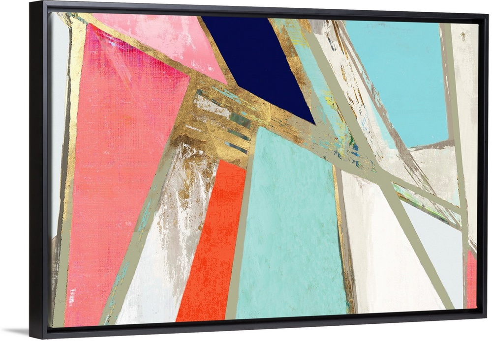<p>Contemporary abstract painting in modern teal, pink, and navy colors with gold edges.</p>