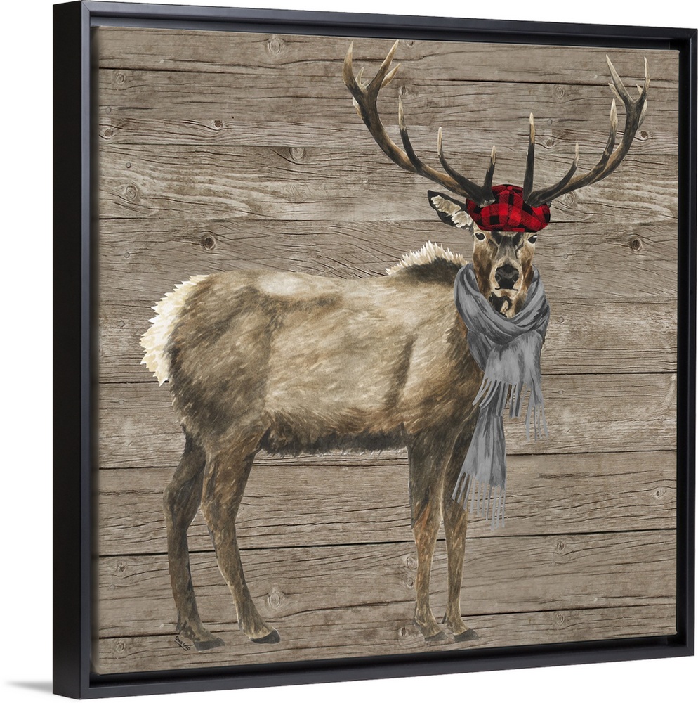 <p>Decorative image of a buck wearing a plaid cap and gray scarf against a wood panel backdrop.</p>
