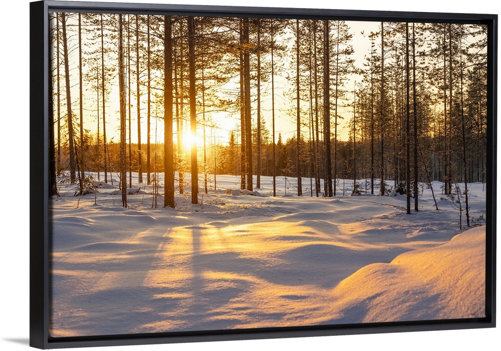 <p>Warm sunlight illuminates a fir forest near Rovaniemi, during a cold winter afternoon, Rovaniemi, Finland, Europe</p>