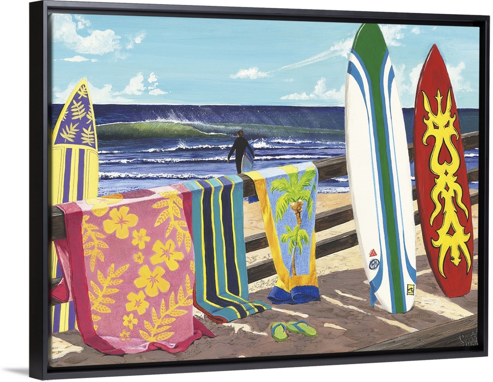 His clearly recognizable images of Hawaii beaches and flowers go alongside iconic surfing art featuring woodie cars, flip flops, surfboards and whimsical dogs.