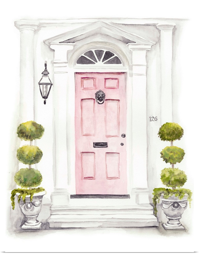 <p>Watercolor artwork of a pink door with white columns and small topiaries.</p>