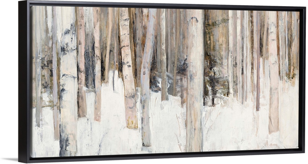 <p>Abstract painting of birch trees in the woods covered in snow with warm tones.</p>