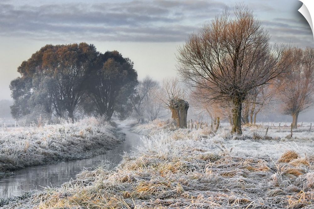 <p>Frost-covered field with a stream and trees, Poland.</p>