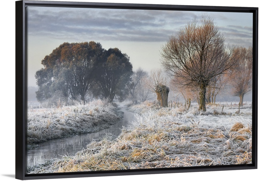 <p>Frost-covered field with a stream and trees, Poland.</p>