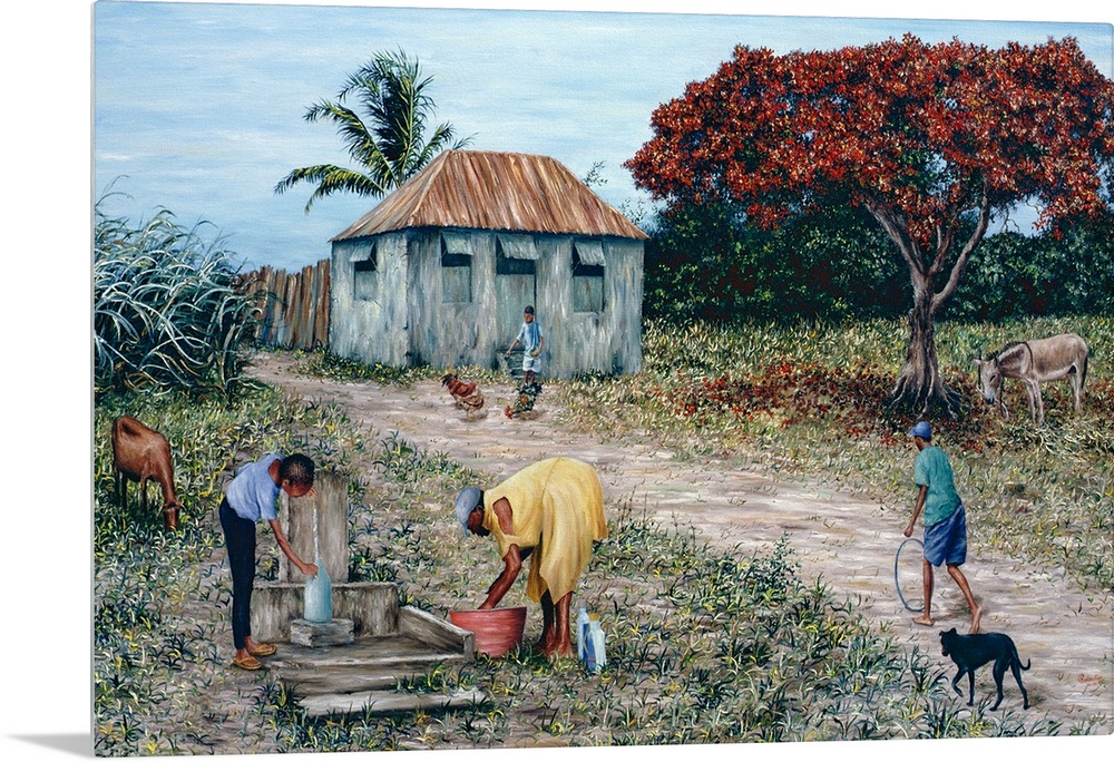 <p>Large artwork of a woman drawing water from a well, a woman washing clothes in a bucket, and two children playing amongst farm animals. A tree and shack and visible in the background.</p>
