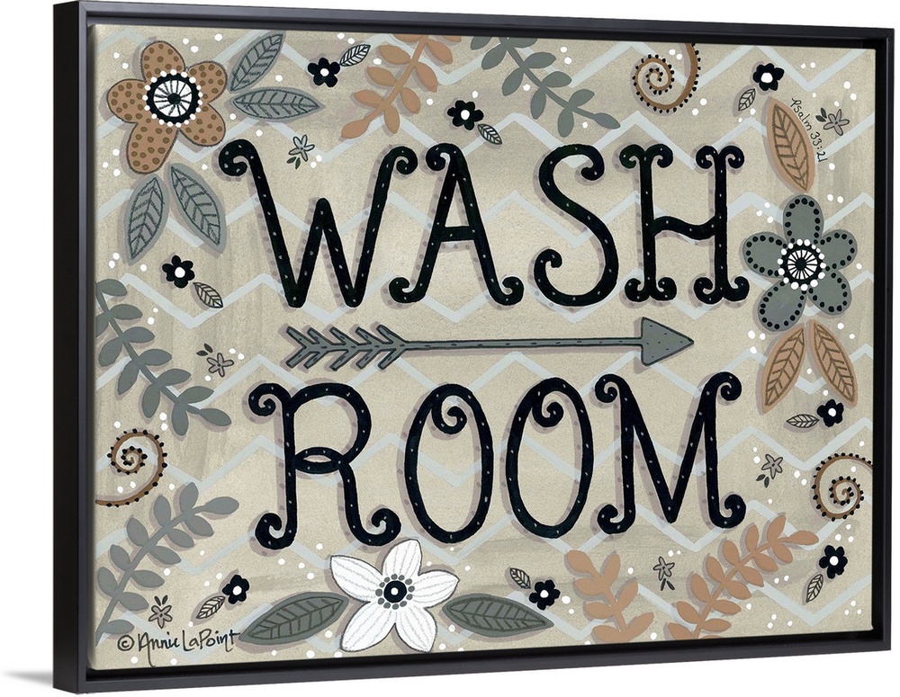 <p>A folk art style sign with flowers and leaves with "Wash Room" in a curly font.</p>