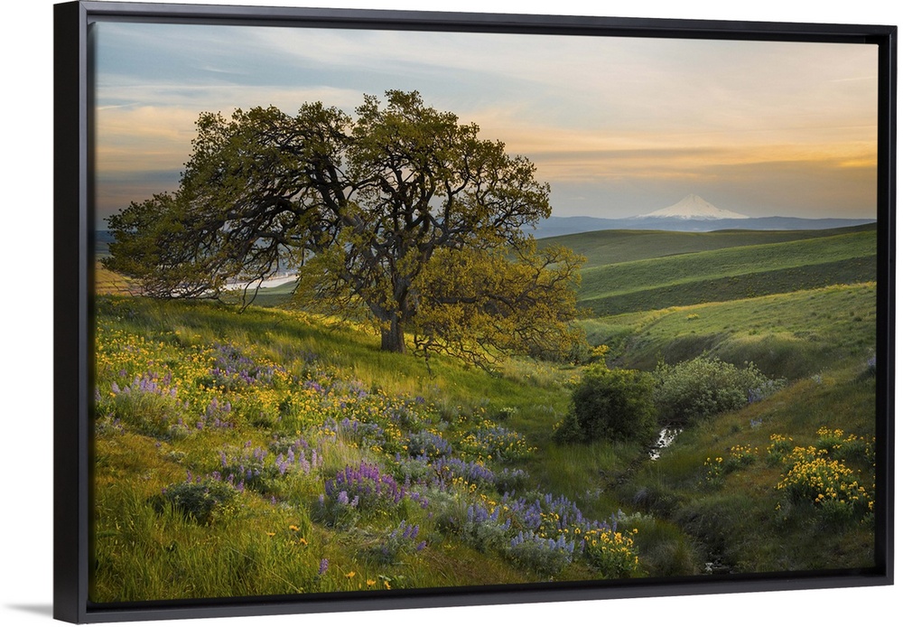 <p>USA, Washington State, Field of Arrowleaf Balsamroot, Lupine and an oak tree at Columbia Hills State Park, Mt. Hood in distance.</p>