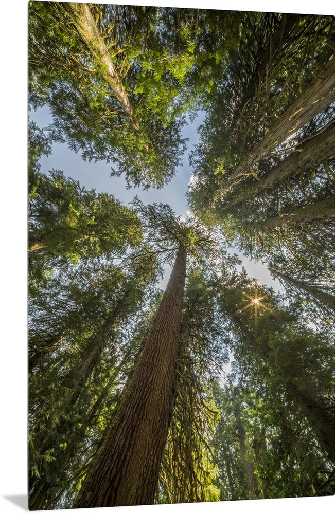 <p>USA, Washington State. Looking up toward tall, mature, old growth conifers at Grove of the Patriarchs, Mt. Rainier NP.</p>