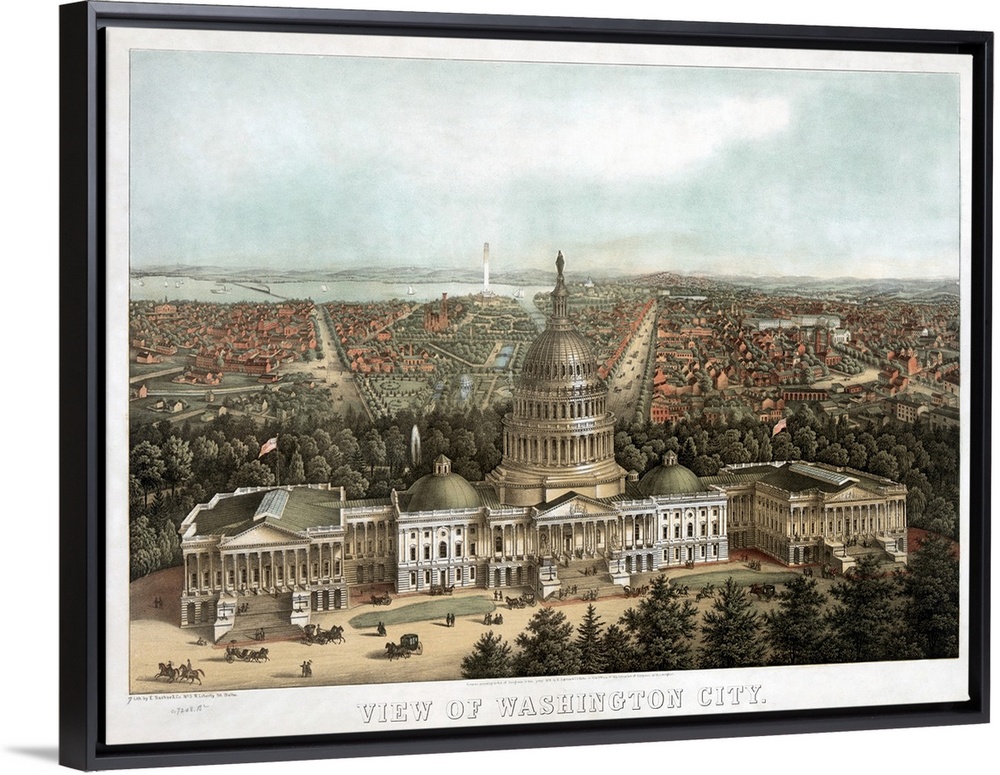<p>Washington, D.C., C1871. Bird's-Eye View Of Washington, D.C., With the Capitol Building In the Foreground, the U.S. Botanic Garden, Smithsonian Institution And the Washington Monument In the Background. Chromolithograph, c1871.</p>