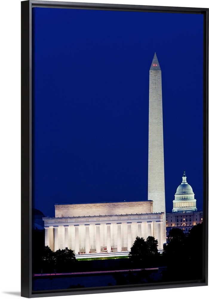 <p>USA, District of Columbia, Washington, DC, Lincoln Memorial, Washington Monument and Capitol Rotunda at dusk on summer evening</p>