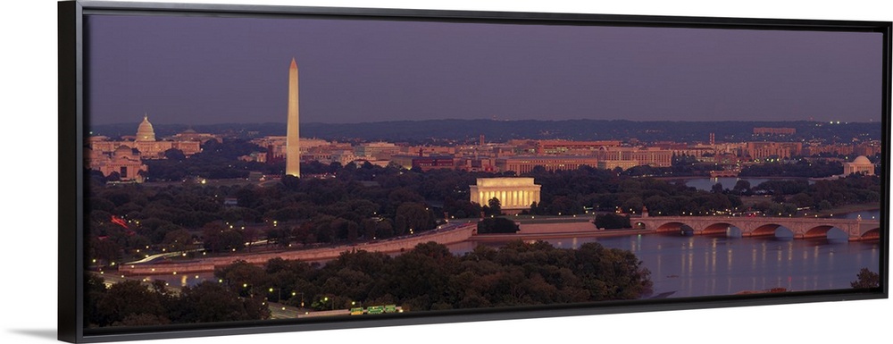 <p>Wide angle, aerial photograph of Washington DC at night, including the Washington Monument, the Capitol Building and the Lincoln Memorial.</p>