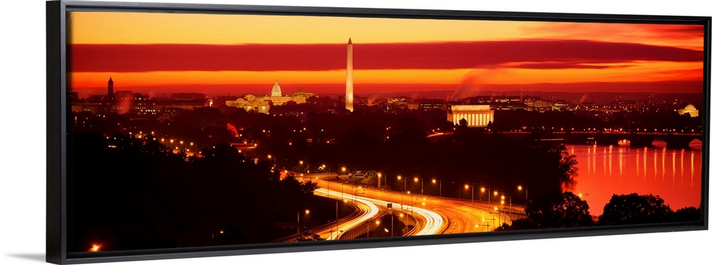 <p>This time lapsed photograph shows the Capitol building, Washington Monument, the Lincoln Memorial, the Potomac River, and Jefferson Memorial in a panoramic shaped wall hanging.</p>