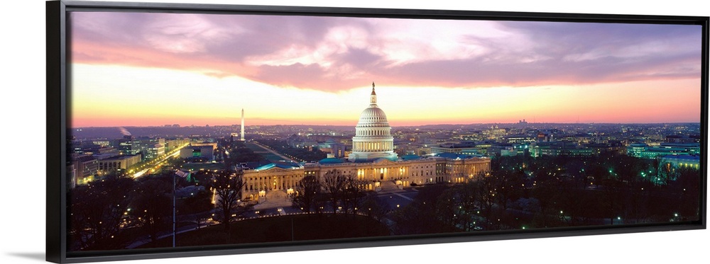 <p>A high angle photograph of the Capital Building and National Mall illuminated in the evening light.</p>