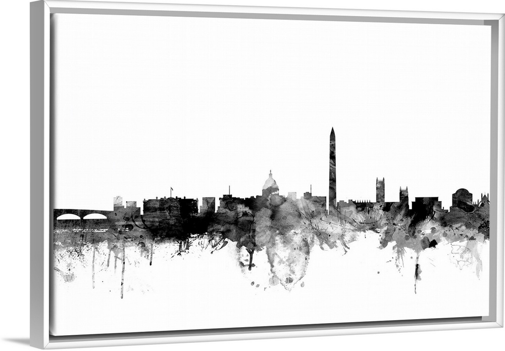 <p>Contemporary artwork of the Washington DC city skyline in black watercolor paint splashes.</p>