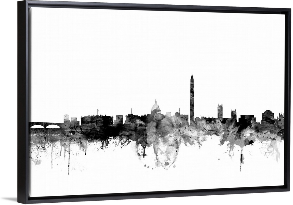 <p>Contemporary artwork of the Washington DC city skyline in black watercolor paint splashes.</p>