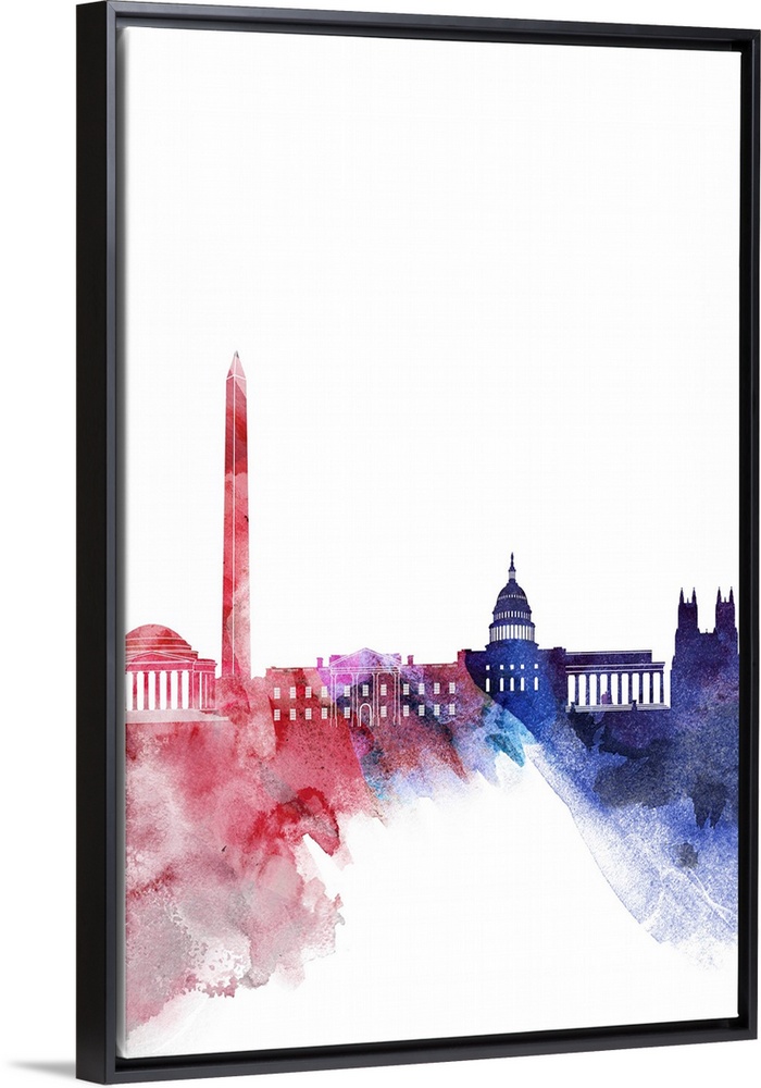 <p>Contemporary watercolor skyline of Washington DC in red white and blue.</p>