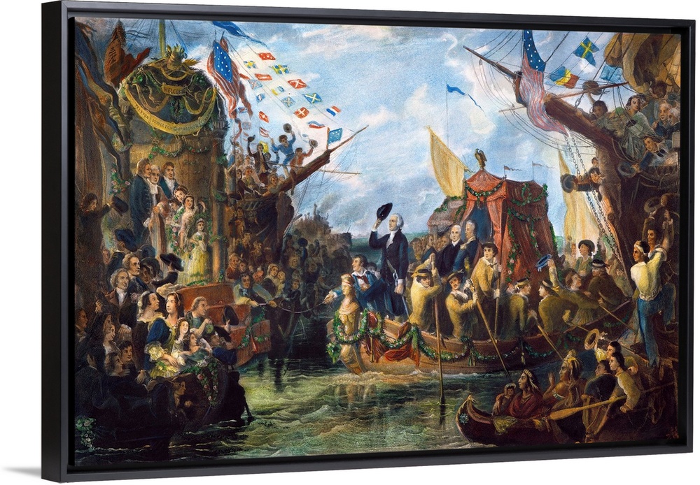 <p>'First in peace.' The arrival of George Washington at the Battery, New York City, 23 April 1789, prior to his inauguration as the first president of the United States on 30 April. Steel engraving, 1866, by John C. McRae after a painting by Henry Brueckner.</p>