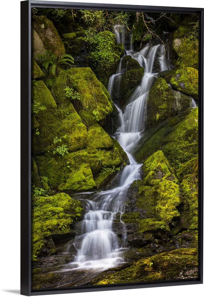 <p>A small waterfall flows down mossy rocks, Washington</p>
