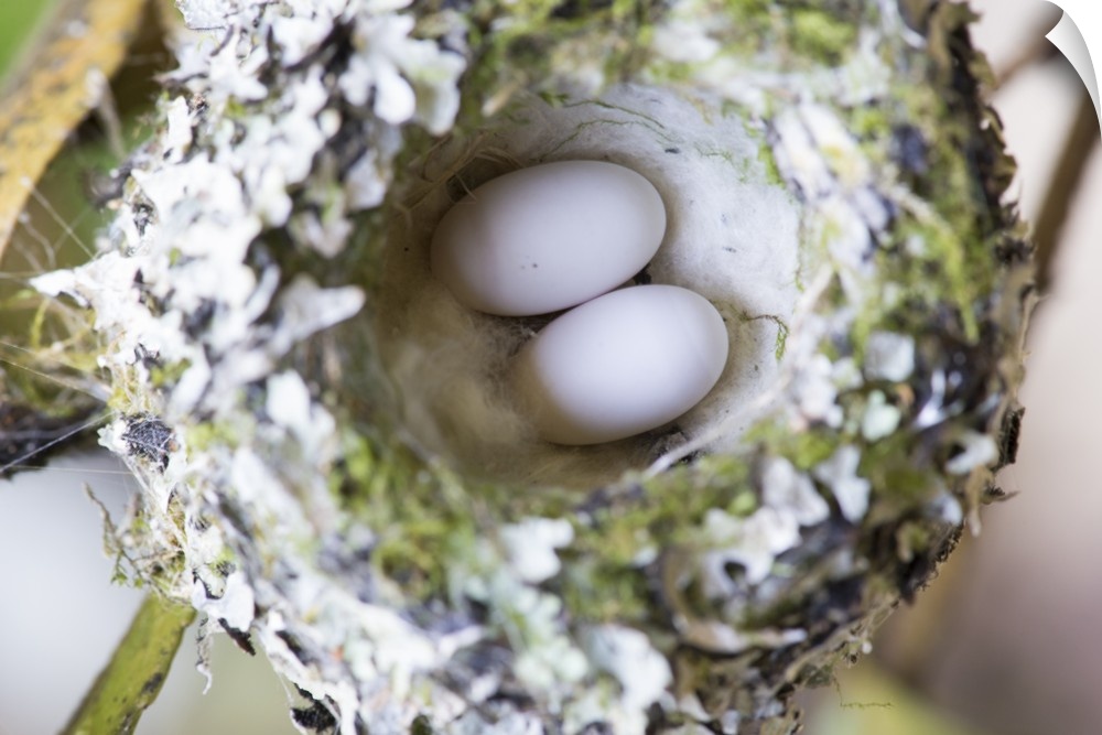 <p>US, WA, Rufous Hummingbird (Selasphorus rufus) nest with eggs. female lines nest with spider silk and uses lichen to camoflauge the outside</p>