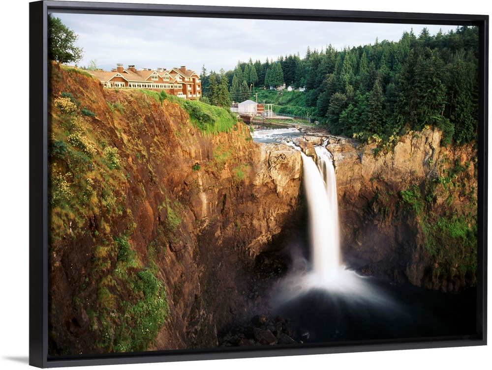 <p>USA, Washington State, Salish Lodge and English Daisies overlook the 270 tall Snoqualmie Falls.</p>