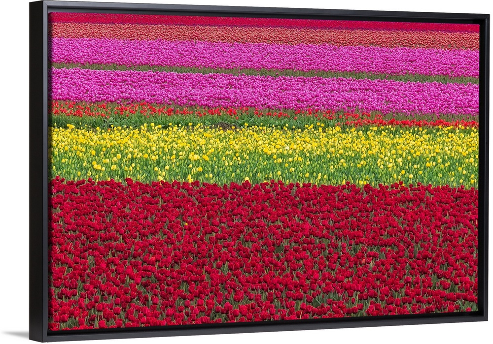 <p>USA, Washington State, Skagit Valley. Row patterns of tulips. Credit: Jim Nilsen</p>