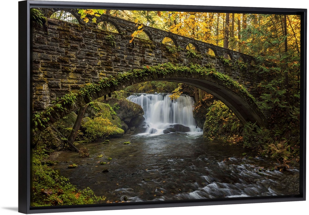 <p>USA, Washington State, Whatcom Falls Park. Fall foliage at Whatcom Falls Bridge. Credit: Dennis Kirkland</p>